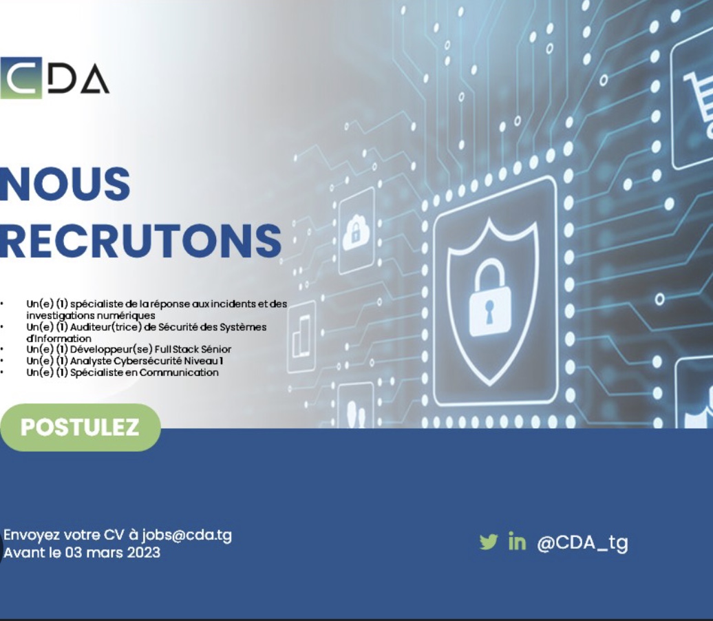 Cyber défense Africa (CDA) recrute du personnel, hautement compétent, motivé, disponible et résolument engagé à travailler à la sécurisation du cyberespace togolais. Ceci dans la perspective de renforcer son effectif mais aussi pour assurer la sécurisation des systèmes d’information au Togo et bien au-delà des frontières.