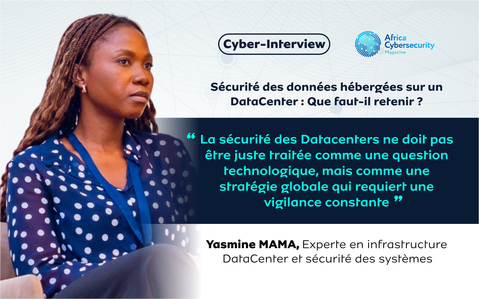 Pour en parler, Africa CyberSecurity Mag a le plaisir de recevoir Mme. Yasmine MAMA, Experte en infrastructure DataCenter et sécurité des systèmes. Avec elle, on aborde des questions fondamentales, telles ce qu’est d'un DataCenter, les enjeux de sa sécurité et les défis majeurs auxquels ces infrastructures doivent faire face. Nous nous pencherons également sur les mesures prises pour garantir la sécurité des données sensibles.