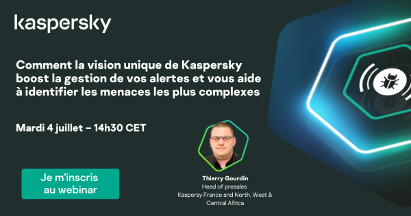 Pour vous aider à comprendre comment Kaspersky peut vous accompagner dans la gestion quotidienne des alertes de sécurité, nous vous invitons à un webinar de 30 minutes sur la question : Le mardi 4 juillet 2023 à 14h30 CET. Ce webinar sera animé par Thierry Gourdin, Head of Presales chez Kaspersky. Au cours de cette session en ligne, il soulignera les avantages de la Threat Intelligence de Kaspersky. En participant à ce webinar instructif, vous découvrirez comment la Threat Intelligence de Kaspersky révolutionne la gestion des alertes en cybersécurité. Vous apprendrez comment exploiter ces informations pour améliorer votre posture de sécurité, détecter les attaques plus rapidement et prendre des mesures proactives pour protéger votre organisation.