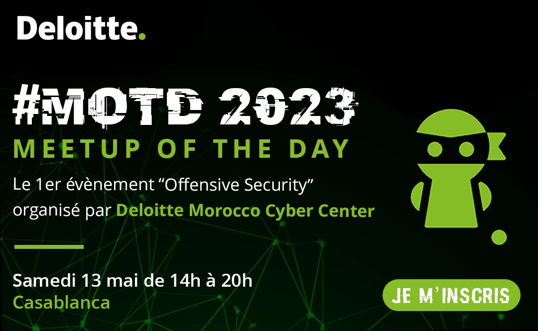 Deloitte organise le samedi 13 mai prochain, la première édition d’un Cyber Event à Casablanca au Deloitte Morocco Cyber Center. Institué sous l’appellation MOTD Meetup Of The Day, cet évènement réunira les passionnés d’Offensive Security. Au cours de l’évènement, il y aura une immersion dans l’univers technique de la cybersécurité (Car Hacking, Red Team, etc.), des conférences, des démos, des CTF, des prix à gagner…et bien d'autres. Des étudiants, des salariés, des freelance et des passionnés de la cybersécurité et de la transformation digitale sont les bienvenus à l’évènement.