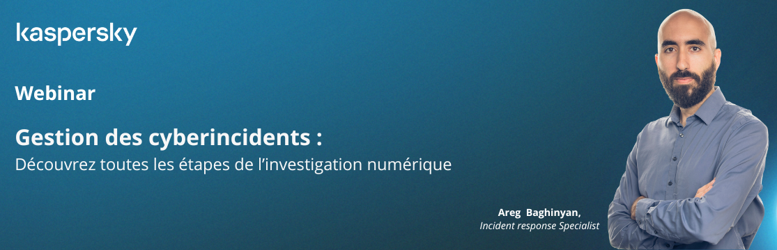 Pour comprendre les tenants et aboutissants de la gestion des cyberincidents, Kaspersky organise un webinar exclusif de 30 minutes animé par Areg Baghinyan le mardi 28 novembre à 14 h 30 CET. En tant qu'expert du Global Emergency Response Team (GERT) chez Kaspersky, il partagera ses connaissances approfondies sur les tactiques des cybercriminels et les meilleures pratiques pour y faire face.